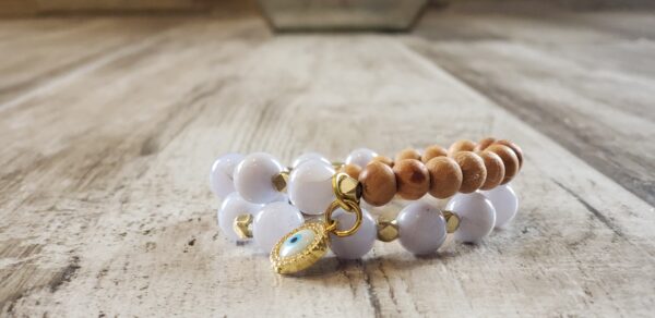 Be the first to review “Blue Lace Agate and Sandalwood Wrap Bracelet with Evil Eye Pendant” Cancel reply